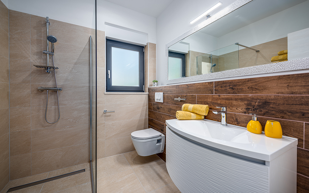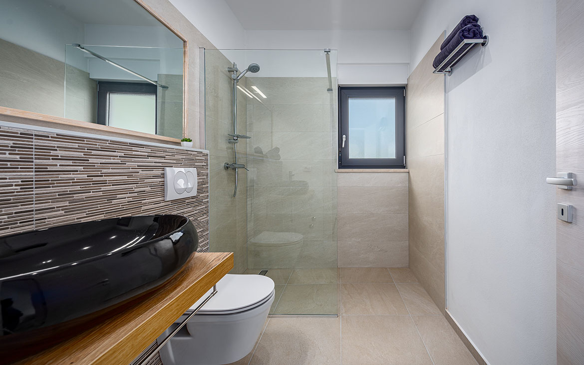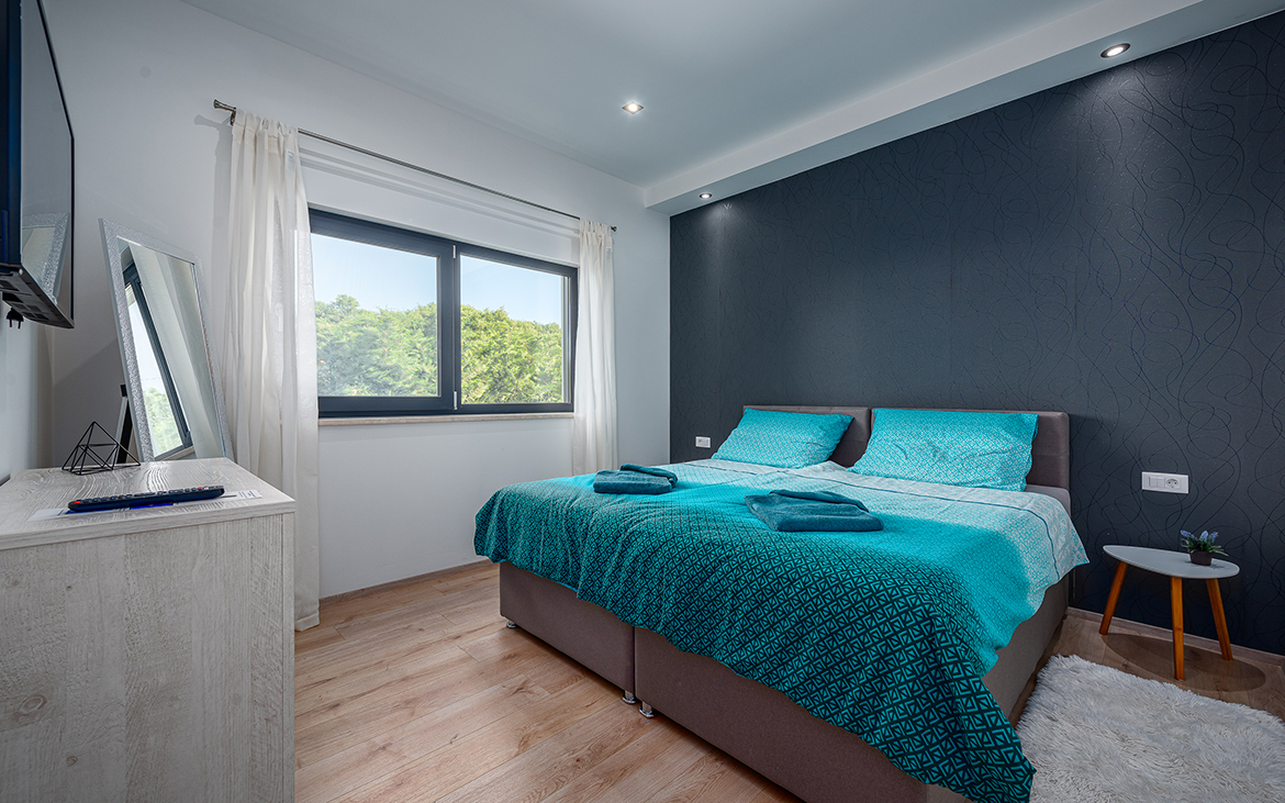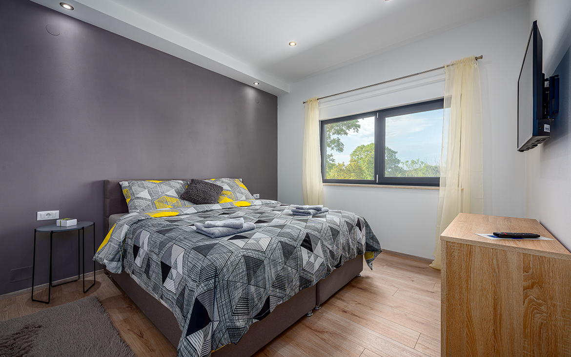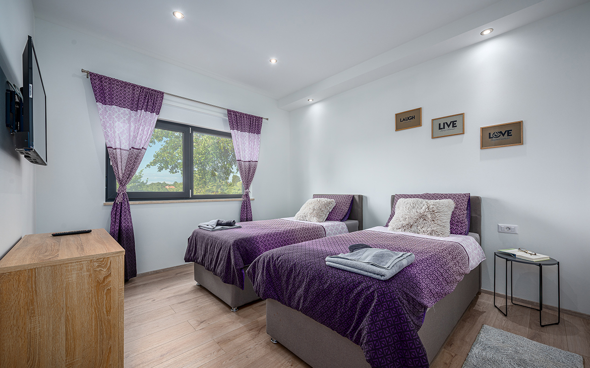 It is immersed in the beautiful countryside of the village of Mali Vareski. The villa has four bedrooms, each with an ensuite bathroom. In each of the bedrooms is a double bed, and the beds in three of the bedrooms can be separated into two single beds, all according to your own preferences. There is also a modern and colorful living room and a dining room. The outdoor area is a calming oasis with the private pool acting as the center of the area. There is also a 40m2 big covered terrace that offers protection from the summer sun and acts also as an al-fresco dining area, the place to be on warm summer nights and enjoy your favorite drink or dish. In the villa, you have free wifi and parking